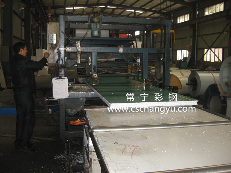 夹芯板也称复合板,是由彩色钢板作表层,闭孔自熄型聚苯乙烯泡沫做芯板,通过上海希明全自动化连接成型机将彩色钢板成型后,用高强度粘合剂粘合而成的一种高效新型复合建筑材料。彩钢夹芯板,常采用企口插入式,它具有安装方便、省时、省材,平整度好,强度高等优点,特别适用于吊顶、隔断系统。