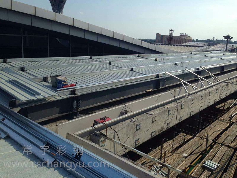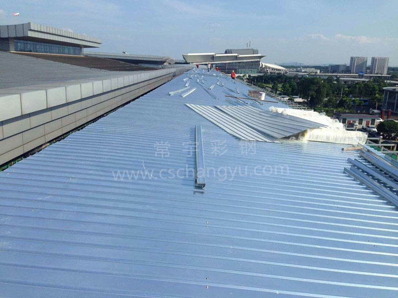 黄花机场材料先后顺序:镀锌C型钢、900镀铝锌彩钢瓦,保温棉,无纺布、900镀锌压型板、镀锌Z型钢、岩棉、铝镁锰板、铝板收边。